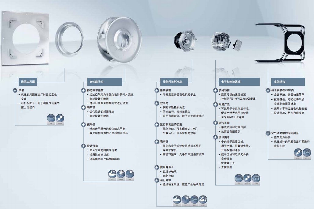 葉輪與綠色科技EC電機巧妙融合,控制電子集成在EC電機中,可通過0-10 V控制信號或Modbus RTU調(diào)節(jié)速度來滿足實際要求。在部分負荷運行時,仍然可以保持高效率。