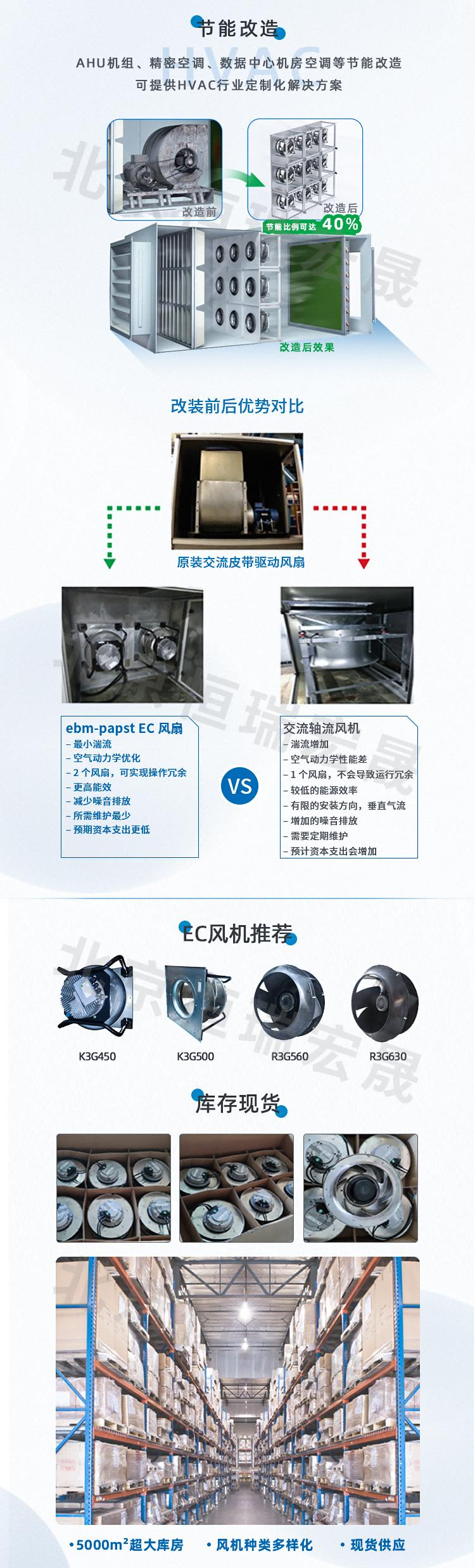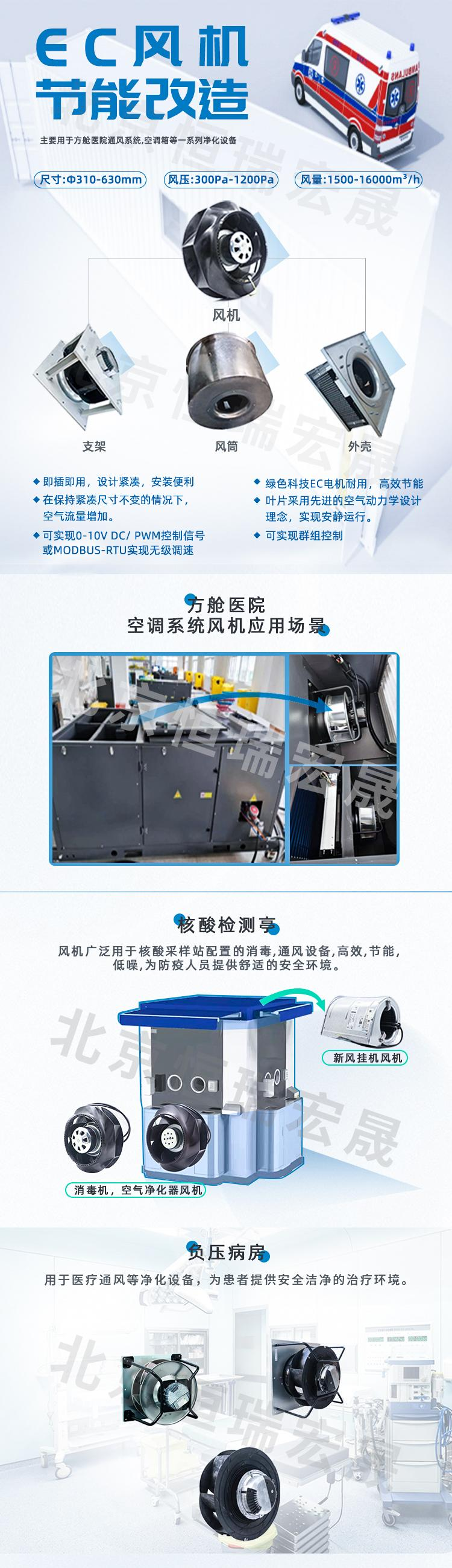 北京恒瑞宏晟專業(yè)供應(yīng)用于方艙醫(yī)院通風(fēng)系統(tǒng)、核酸檢測亭、負壓病房、消毒柜、除濕機等設(shè)備高性能AC/EC風(fēng)機。同時具備公共建筑、數(shù)據(jù)機房、商用建筑等通風(fēng)節(jié)能改造能力及方案,是您節(jié)能改造的最優(yōu)選擇,歡迎廣大客戶朋友考察推薦!