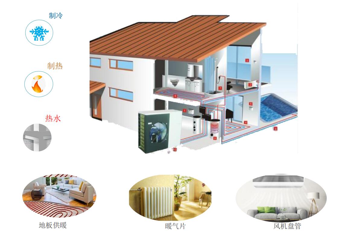 空氣能熱泵自身為一個提供熱水的設(shè)備。它供熱,然后配合其他的采暖末端實現(xiàn)供暖,如暖氣片、風機盤管、空氣能地暖機、地暖管道等都可以作為其采暖末端,可以根據(jù)不同的住宅選擇不同的采暖方式。