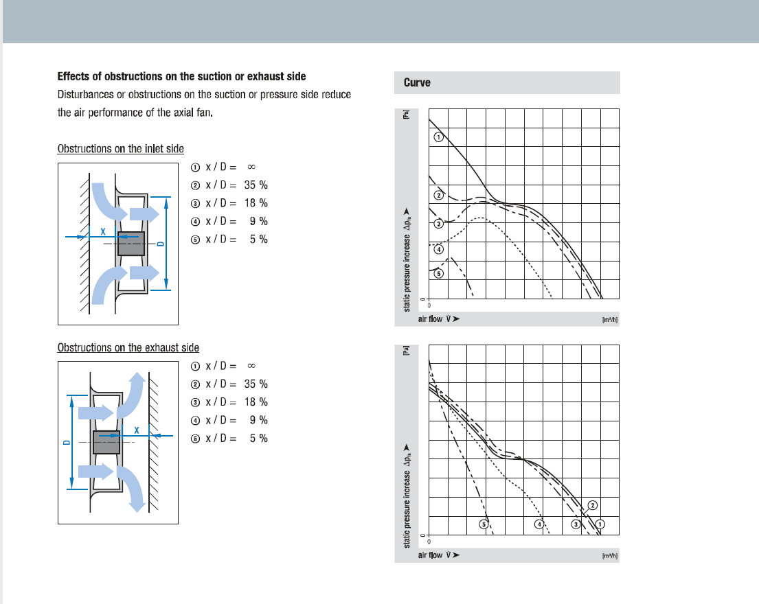 從以上性能圖表可以看出,無論是進風口還是出風口,距離障礙物的距離均為葉輪直徑的35%以上是最佳
