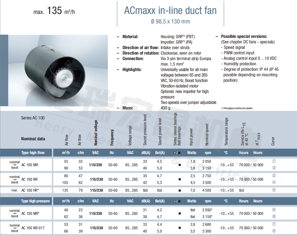 Aci4420HH風(fēng)量:175m³/h 電壓:230v 電流:5.3A 功率:4.6W 轉(zhuǎn)速:3300r/min